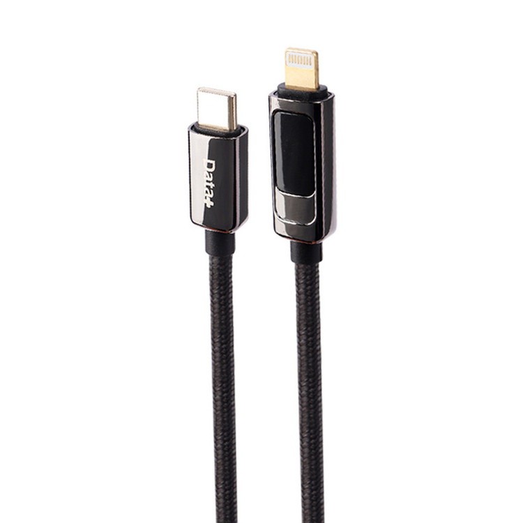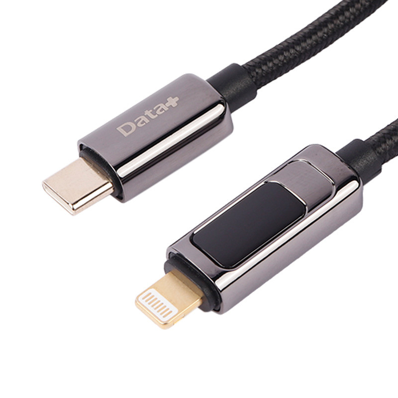 کابل تایپ سی به لایتنینگ دیتاپلاس data+ DP-R320L Type-C to Lightning دارای شدت جریان عبوری 3 آمپر در ولتاژ 9 ولت و همچنین مجهز به نمایشگر LED جهت نمایش مقدار توان مصرفی می باشد. کابل DP-R320L دیتا مجهز به فناوری شارژ سریع و تکنولوژی PD با توان خروجی 30 وات است و همچنین قابلیت انتقال اطلاعات را نیز دارد، طول کابل تایپ سی به لایتنینگ دیتا پلاس 1 متر و جنس روکش از الیاف بهم بافته شده مقاوم در برابر کشش، خمیدگی و پارگی می باشد. کانکتور ها از نوع تایپ سی و لایتنینگ و ساخته شده از جنس فلز مقاوم در برابر فشار و ضربه هستند.